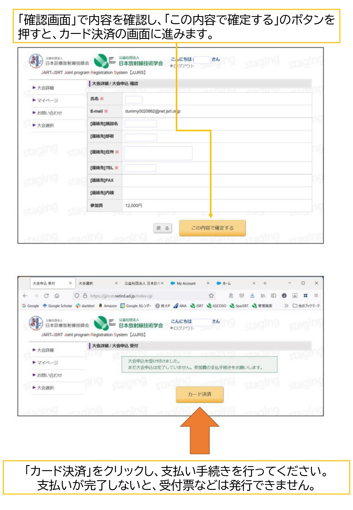 カード決済を中断した場合、下記に掲載しているマイページの申込日時(青文字部分)から再度決済画面へ移行できます。