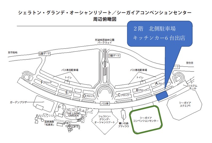 シーガイアコンベンションセンター外、2 階北側駐車場でキッチンカーを出店しています。ぜひ、お越しください。